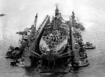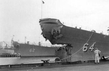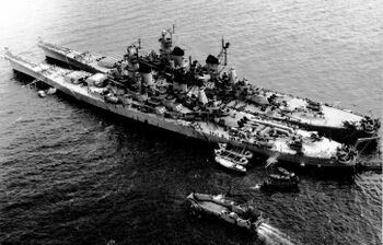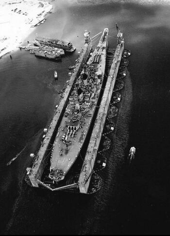 Линкор USS Wisconsin с поврежденным носом, 1950-е гг.