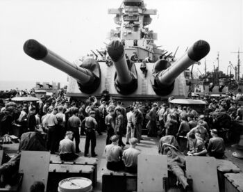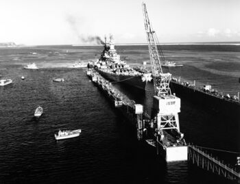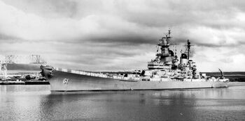 Линкор USS Missouri входит в Токийский залив, 29 август 1945 г. Линкор Iowa на заднем плане.Линкор USS Missouri в Токийском заливе, 2 сентября 1945 г.Линкор USS Missouri ведет огонь главным калибром. Корея, февраль 1951 г.Буксиры пытаются столкнуть USS Missouri с мели. Вирджиния, 17 января 1950 г.Линкор USS Missouri в Токийском заливе, 30 августа 1945 г.Линкор USS Missouri ведет огонь из второй башни по целям на побережье Кореи, октябрь 1950 г. Автограф Ч.Нимитца.Нос линкора USS Missouri перед спуском на воду. Верфь Нью-Йорка, январь, 1944 г.USS Missouri на День Флота. Нью-Йорк, 27 октября 1945 г. Эсминец USS Renshaw с президентом Г.Трумэном у борта линкора.Буксиры пытаются столкнуть USS Missouri с мели. Вирджиния, 17 января 1950 г.Линкор USS Missouri в бухте Фабирон, Пирей, Греция, 10 апреля 1946 года.Линкор USS Missouri с президентом Г.Трумэном на борту прибыл из Рио-де-Жанейро в Норфолк, 19 сентября 1947 г.Линкор USS Missouri в Панамском канале, 13 октября 1945 г.Буксиры пытаются стянуть USS Missouri с мели. Вирджиния, 17 января 1950 г.Линкор USS Missouri в испытательном плавании, конец августа 1944 г.Линкор USS Missouri у о.Форд. Перл-Харбор, сентябрь 1945 г.Линкор USS Missouri в гавани Нью-Йорке, 30 июля 1944 г.Линкор USS Missouri в море, июнь 1950 г.Линкор USS Missouri в гавани Нью-Йорка, 30 июля 1944 г.Испытательные стрельбы главного калибра линкора USS Missouri, конец августа 1944 г.Линкор USS Missouri в море, начала 1945 г.Линкор USS Missouri, 28 марта 1950 г.Линкор USS Missouri в составе TG-22.1, 2 мая 1950 г.Линкор USS Missouri на учениях десантных сил. Пуэрто-Рико, март 1949 г.Буксиры пытаются столкнуть USS Missouri с мели. Вирджиния, 21 января 1950 г.Корпус линкора USS Missouri перед спуском на воду. Верфь Нью-Йорка, январь, 1944 г.Самолет A6M Zero врезался в борт USS Missouri под главной палубой, причинив незначительные повреждения и не причинив жертв на борту линкора. Окинава, 11 апреля 1945 г.Портовые буксиры выводят линкор USS Missouri на форватер, лето 1944 г.Подписание капитуляции Японии на борту линкора USS Missouri, 2 сентября 1945 г.3-й флот на фоне горы Фудзияма, 28 августа 1945 г. Линкор USS Missouri, далее - HMS Duke of York, HMS King George V и USS Colorado.Линкор USS Missouri в Стамбуле, 5 апреля 1946 г. Справа - линейный крейсер Yavuz, слева - эсминец USS Power.Линкор USS Missouri, 2 сентября 1949 г. Празднование дня победы над Японией. Центр круга - место где стоял стол, 406-мм башня развернута как в тот день.Генерал Ёшижиро Уметцу подписывает капитуляцию Японии. Линкор USS Missouri, 2 сентября 1945 г.Линкор USS Missouri в камуфляже MS.32/22D, 26 октября 1944 г.Линкор USS Missouri в Токийском заливе, 1945 г.