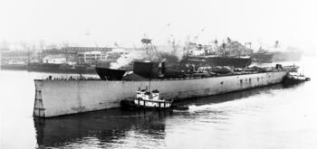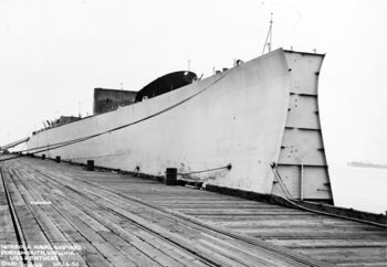 Корпус линкора USS Kentucky без носовой части. Военно-морская верфь, Норфолк, июль 1958 г.Корпус линкора USS Kentucky без носовой части. Военно-морская верфь, Норфолк, 24 октября 1956 г.Буксировка корпуса линкора USS Kentucky на слом в Балтимор. Чесапикский залив, 6 февраля 1959 г.