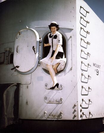 Старшина третьего класса Бетти Мартин выходит из задней двери 127-мм артиллерийской установки. Линкор USS Missouri, конец августа 1944 г.Линкор USS Missouri (в центре), авианосец USS Bennington в достройке. Верфь флота, Нью-Йорк, 9 марта 1944 г.Линкор USS Missouri в камуфляже. Тринидад, 1944 г.