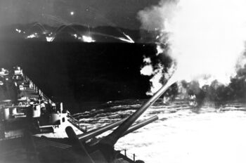 Ночные учебные стрельбы из 127-мм орудий линкором USS Missouri, конец августа 1944 г.