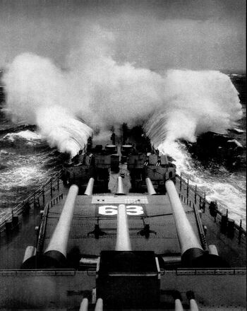 Линкор USS Missouri в штормовом море эскортирует авианосцы, .Линкор USS Missouri по возвращении из Кореи.