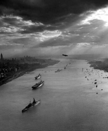 Линкор USS Missouri входит в гавань Нью-Йорка, октябрь 1945 г.