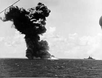 Линкор USS Missouri ставит нефтяную завесу, 1945 г.