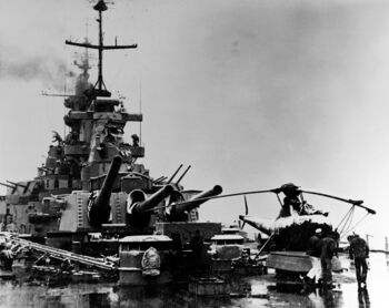 Линкор USS Wisconsin в составе TF-77. Корея, 8 февраля 1952 г. Вертолет «Sikorsky» HO3S-1.Линкор USS Wisconsin по пути на Филиппины, декабрь 1944 г.