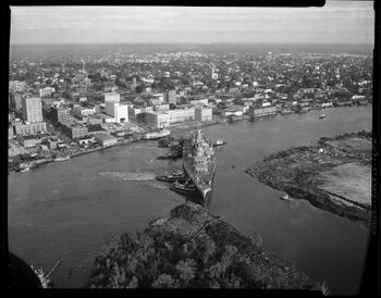 Линкор USS North Carolina отбуксирован в Уилмингтон, Северная Каролина, для использования в качестве корабля-музея, 1961 г.