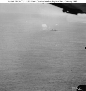 Линкор USS North Carolina обстреливает о.Иводзима, 21-22 февраля 1945 г.