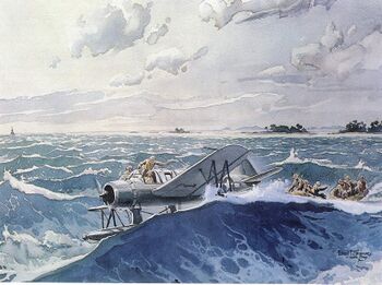 Поврежденный гидросамолет Vought OS2U «Kingfisher» линкора USS North Carolina, 1 мая 1944 г. Лодка USS Tang и самолет занимались спасением летчиков. Лодка сняла экипаж с 9 летчиками и уничтожила самолет.