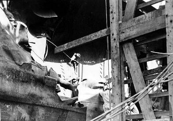 Ремонт торпедной пробоины USS North Carolina, 11 октября 1942 г.