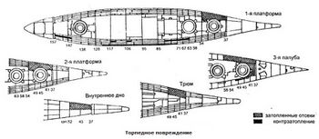 В корпусе имелось три палубы, две платформы, трюм и тройное дно. Первая палуба, она же главная, верхняя, или бомбовая, плавно поднималась к носу чуть более, чем на три метра. Весь кормовой участок шел параллельно ватерлинии. Ниже располагалась вторая палуба, являвшаяся главной броневой. Она была горизонтальной на протяжении цитадели. Третья, или осколочная, палуба была параллельна второй практически на всем протяжении.