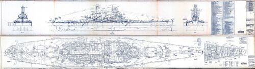 Всего за год с небольшим Бюро строительства и ремонта[2] было представлено на рассмотрение 38 проектов, получивших обозначения римскими цифрами. Первую серию с I по V Совету представили уже 15 октября 1935 года. В августе-октябре 1936 года была рассмотрена последняя серия вариантов проекта (с XVI по XVI-D). Базовый XVI имел водоизмещение 35 000 т, скорость 27 узлов, 12 356-мм орудий и 16 127-мм универсалок (6×2 и 4×1) и 285-мм пояс. Четыре остальных (с XVI-A по XVI-D) представляли собой последнюю попытку увеличить скорость до 30 узлов.