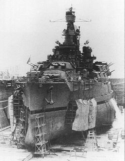 С началом боевых действий линейные корабли ВМС США имели защитную окраску по схеме Measure 12 Graded System, «splotch pattern» (пятнистый раскрой). По бортам этот камуфляж состоял из крупных неправильных пятен светло-серого (Ocean Gray 5-O) и темного сине-серого (Navy Blue 5-S) цветов с волнистыми переходами. На надстройках и башнях наряду с первыми двумя присутствовали области третьего цвета - дымчато-серого Haze Gray 5-Н. Горизонтальные поверхности (палубы, крыши башен) всегда окрашивались в приглушённый синий тон Deck Blue 20-В.