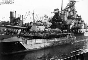 Линкор USS Washington после ремонта поврежденного носа на верфи ВМС, Пьюджет Саунд, 26 апреля 1944 г.
