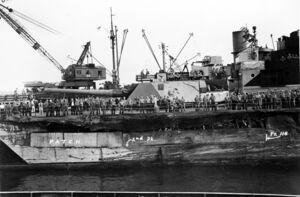 Срочный ремонт носовой части USS Washington плавмастерской USS Vestal, февраль 1944 г.