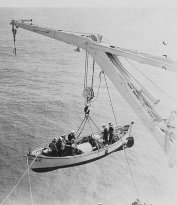 Носовые 356-мм башни и надстройка линкора USS New York, конец 1945 г.Подъем вельбота во время учений «человек за бортом» на линкоре USS New York, 1930-х гг.