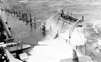 Носовая часть линкора USS New York в штормовом море, 1932 г.Брызги на квартердеке USS New York, с вельботом, вывешенным за борт, Справа внизу - хвост O2U-1, находящегося на катапульте башни №3.