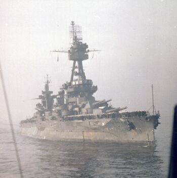 Носовая надстройка с радаром XAF на ходовой рубке, 356-мм башня №2 с дальномером линкора USS New York, 1938-39 гг. 127-мм и 76-мм орудия.