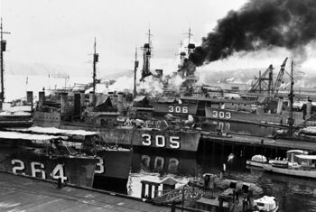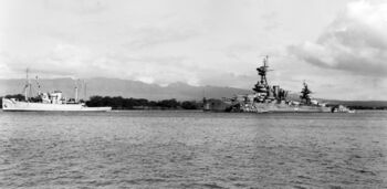 Линкоры USS New York (слева) и USS Nevada в Перл-Харборе перед учениями, 8 июня 1948 г.Линкоры USS New York, USS Texas (ведет огонь) и USS Wyoming на полном ходу в ходе маневров.Буксировка USS New York к месту учений. Перл-Харбор, 6 июля 1948 г.