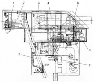 Ниже третьей палубы располагались две платформы. Первая, или верхняя, платформа начиналась от форштевня, имела разрыв над машинными отделениями и заканчивалась у шпангоута 123, за которым находился отсек рулевых машин. Вторая платформа была короче. Она шла от носовых дифферентных цистерн (шп.2-9, емкость 45 и 59 т), разрывалась котельными и машинными отделениями и заканчивалась также у рулевого отсека. Ниже второй платформы располагался трюм. Его палуба начиналась от пустого отсека в носу и шла до кормовых дифферентных цистерн (шп.123-135, емкость 96 и 24 т), находившихся как раз под отсеками рулевых машин и приводов. Ниже трюма следовала полость двойного дна, которая охватывала всю длину корпуса, поднимаясь у бортов до уровня третьей палубы.