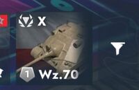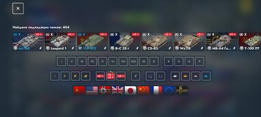 Расположен справа от карусели техники. При нажатии на данную кнопку происходит раскрытие интерфейса сортировки (или же фильтрации) техники, где можно выбрать нужные фильтры для поиска нужного танка из имеющихся в ангаре танкиста (уровень техники, её класс, доступность получения бонуса за первую победу или за день рождения техники, поиск закреплённых танков, по её статусу и типу, а также по нации танка). При включенном фильтре под знаком воронки появится зелёная полоса.