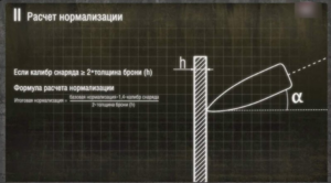- Правило двух калибров: если калибр снаряда превышает толщину брони (без учёта угла вхождения) более чем в два раза, то угол нормализации увеличится по следующему правилу: итоговая нормализация = угол нормализации снаряда * 1,4 * калибр снаряда / 2 * бронирование в месте попадания.