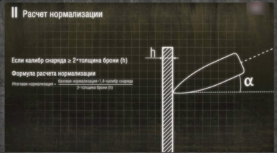 Проверяется правило двух калибров. Если оно работает, то базовая нормализация заменяется на рассчитанную по следующему правилу: итоговая нормализация = угол нормализации снаряда * 1,4 * калибр снаряда / 2 * бронирование в месте попадания.