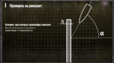 - Угол рикошета рассчитывается относительно нормали поверхности и составляет 70 градусов для бронебойных и подкалиберных снарядов. Кумулятивные и фугасные снаряды рикошетить не могут.