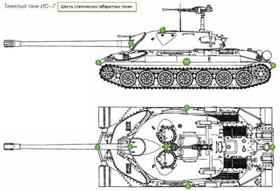 - Расстояние до танка не больше, чем Радиус обзора (м) − (Радиус обзора (м) − 50 м) × коэффициент маскировки . И как минимум из одной обзорной точки танка можно провести луч до одной из габаритных точек обнаруживаемого танка, и на пути этого луча не будет препятствий (рельефа, зданий, деревьев, кустов).
