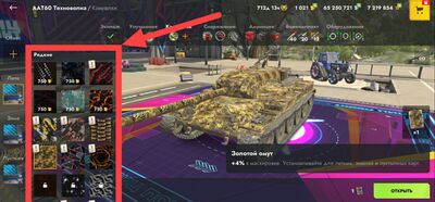 | Камуфляж — внешняя специальная окраска танка, украшающая его, а иногда вообще меняющая внешний вид. Доступ к нему возможен в соответствующем разделе вкладки «Камуфляж» в Ангаре на всей технике, за исключением некоторых премиум или коллекционных машин, имеющих уникальную раскраску. В игре представлено несколько редкостей камуфляжа — обычный, редкий, эпический и легендарный.