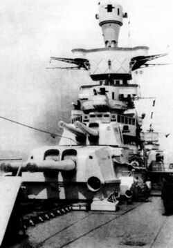 Данная схема окраски сохранилась и после начала боевых действий. Единственным существенным отличием стало введение знаков идентификации с воздуха: палубу полубака до барбета носовой башни выкрасили в белый цвет, а после сражения у Пунта-Стило по приказу адмирала Кампиони нанесли широкие диагональные бело-красные полосы - аналогичным образом еще с довоенных времен окрашивались верхние плоскости корабельных гидропланов.