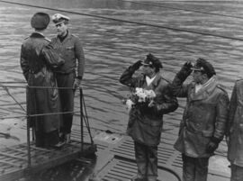 Встреча U-703 в Бергене (Кохауц крайний слева). -