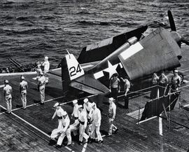 F4U-4 Corsair из эскадрильи VMF-312 на палубе USS Bataan весной 1952 года в Корее.