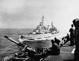 - В 1945 г. были демонтированы 18 одноствольных зенитных орудий 20-мм/70 Oerlikon. Установлены два спаренных орудия 40-мм/56 Bofors Mk 1.2. Радар SC-2 заменен на радиовысотомер SP.