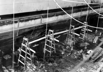 - ↑ Американцы считают, что это была такая же «переделка» из 356-мм (реально - 410-мм) снаряда, как и та, что погубила USS Arizona, однако во второй ударной волне бомбардировщики-торпедоносцы B5N не несли таких бомб, да и атаковавшие пирсы Арсенала пикировщики D3A1, никогда не поднимали в воздух ничего тяжелее 250-кг бронебойной бомбы.