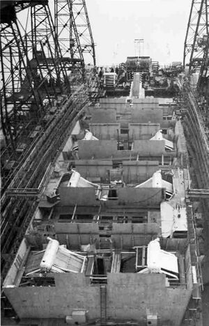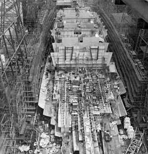 Набор корпуса выполнялся по продольной схеме, шпация составляла 1,22 м. Главные поперечные переборки делили его на 32 водонепроницаемых отсека. На большей части длины корпуса (от 36-го до 173-го шп.) имелось тройное дно. Три палубы - верхняя и две внутренних - были сплошными, три расположенные ниже платформы в середине разрывались машинно-котельными отделениями. В конструкции корабля наряду с клепкой широко применялась электросварка.