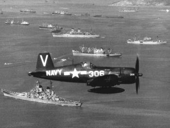 Линкор USS Missouri и два эскортных авианосца, 1945 г.