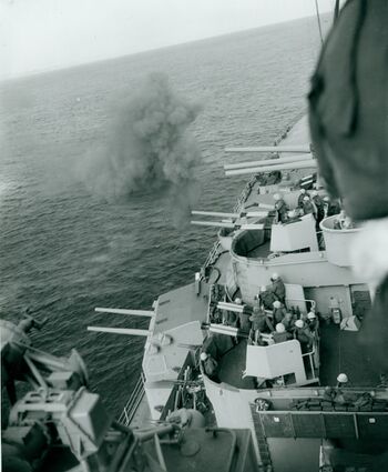 Линкор USS Missouri ведет стрельбу из носовых 406-мм орудий, 1944-45 гг. Справ видны выпущенные снаряды.