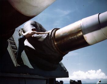 Старшина третьего класса Бетти Мартин выходит 127-мм установки. USS Missouri, конец августа 1944 г.