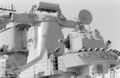 Вид на системы управления огнем Mark 37 и радар Mark 25 справа, директор Mark 38 и радар Mark 13 по центру на корме линкора USS Missouri.