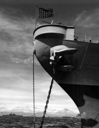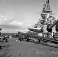 Команда выстроилась в парадном построении на главной палубе в честь Дня ВМФ. В правом нижнем углу виден радар на крыше боевой рубки, октябрь 1945.