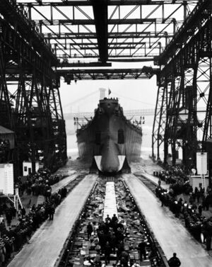 Корпус линкора USS Missouri начал движение по стапелю. Верфь Нью-Йорка, 29 января 1944 г.